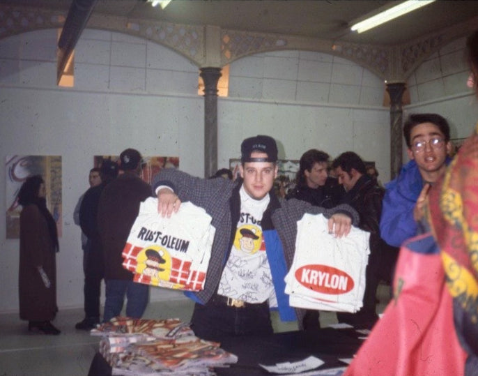 Stash selling Krylon and Rust-oleum Tees in Paris at art show "Paris Graffiti". Circa 1991